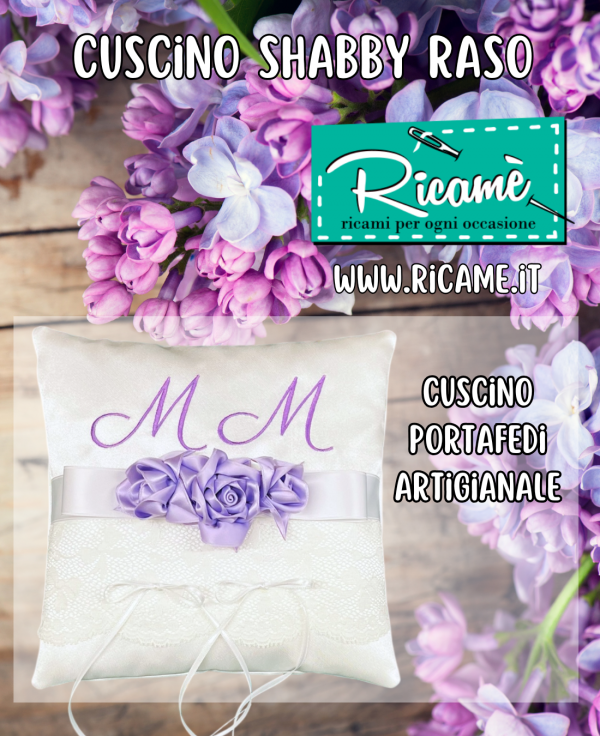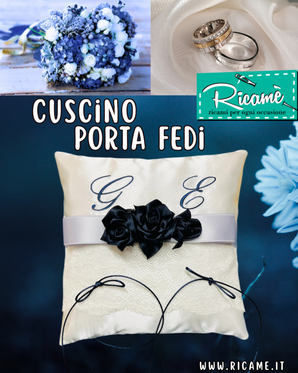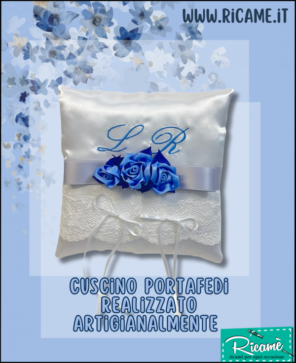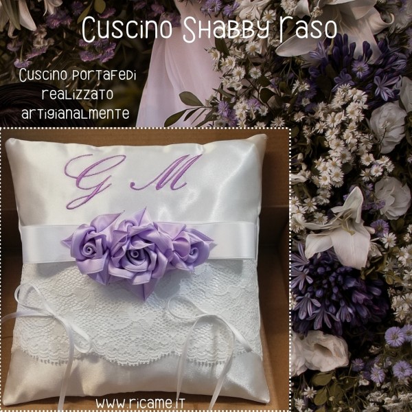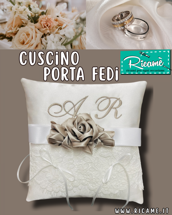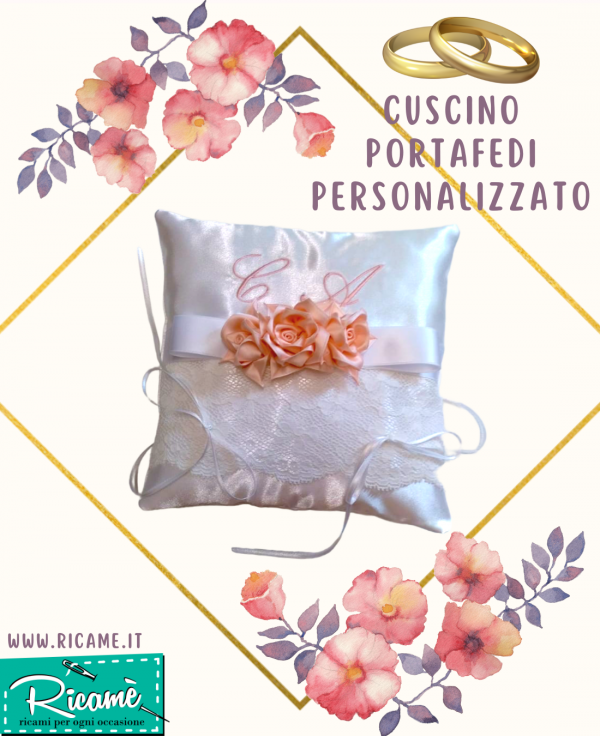 Nel giorno del grande sì... Tutti i dettagli sono importanti... Cuscino portafedi realizzato artigianalmente in prezioso raso bianco, rifinito con pizzo valenciennes, nastro di raso e roselline; dimensioni cm. 20 x 20. Le iniziali possono essere ricamate in qualsiasi colore, e le roselline verranno realizzate nel colore più simile al filo del ricamo