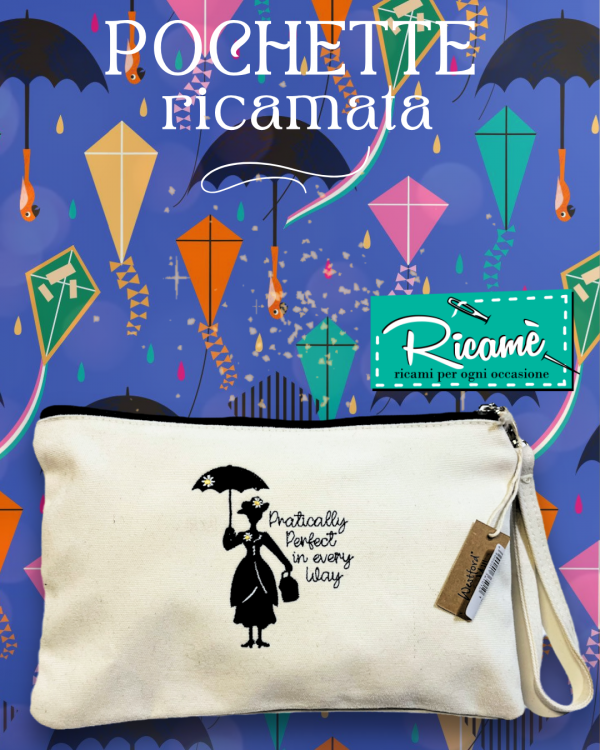 Pochette con ricamo Mary Poppins in 100% cotone Canvas con comodo braccialetto e chiusura zip.